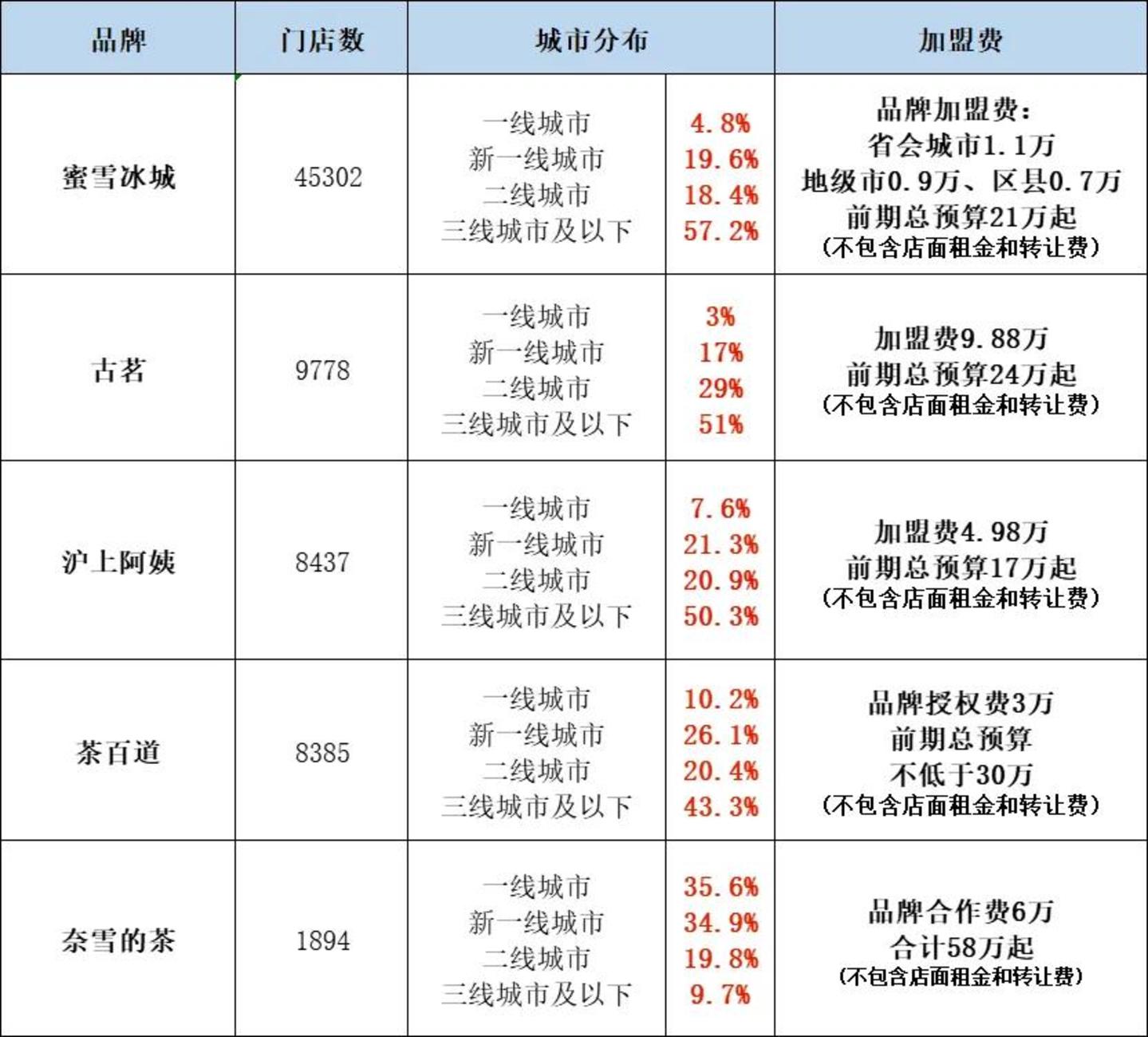 ▲ 注:蜜雪冰城、古茗数据截至2024年9月30日,沪上阿姨、茶百道、奈雪的茶数据截至2024年6月30日;加盟信息来自官网和咨询客服所得。
