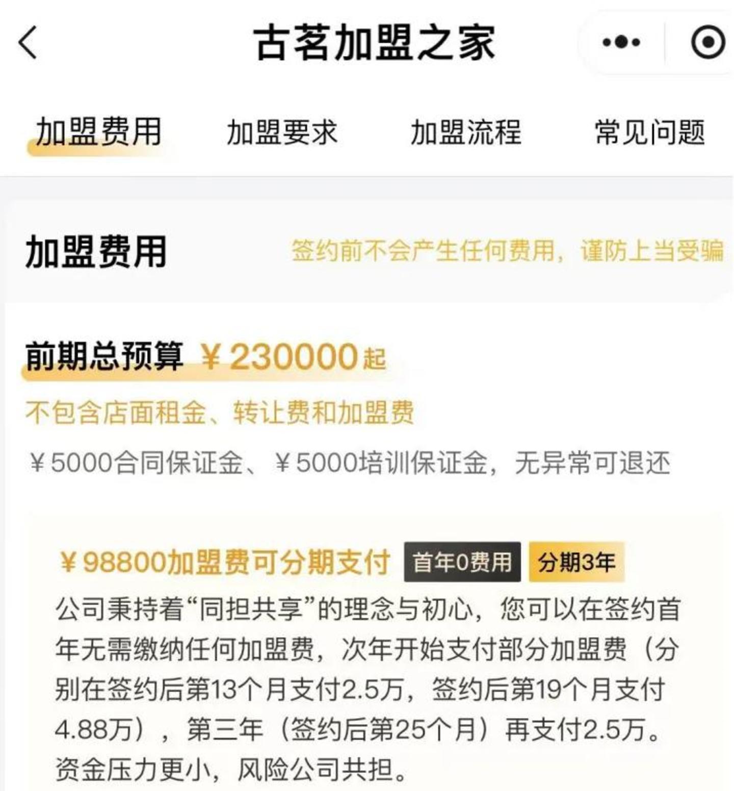 同时,考虑到加盟是目前品牌方实现规模扩展和盈利的核心组成部分之一,为了吸引更多的创业者加入进来,一些品牌方往往也会绞尽脑汁推出各种极具诱惑力的加盟政策,因为有人进来钱就赚到手。比如,古茗曾对加盟商实行了“0加盟费”政策,而后再进行逐步收费,让加盟商“先赚钱后付费”。