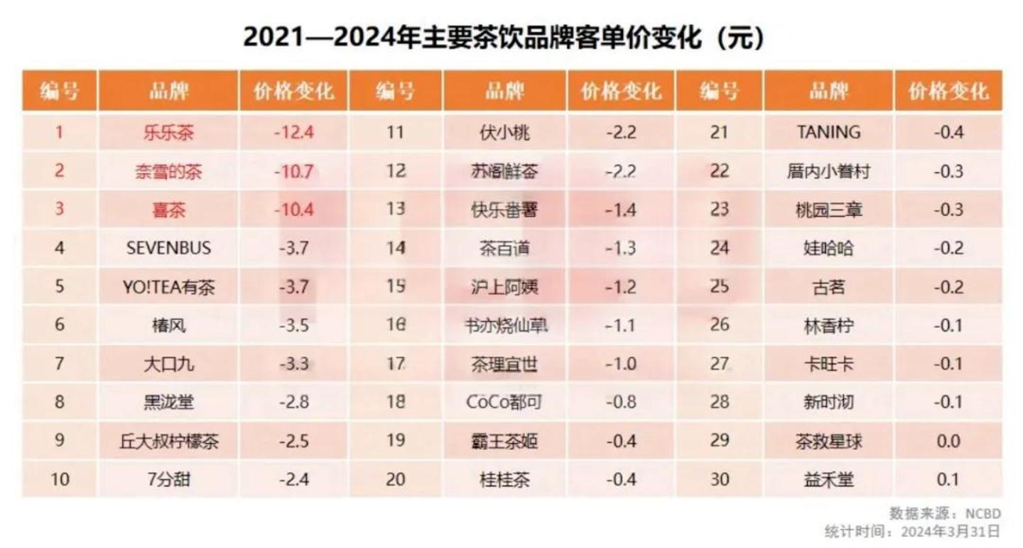 新式茶饮市场这几年的确在价格方面陷入了胶着状态,据餐宝典的数据统计,2021年至今2024年期间,包括奈雪的茶、喜茶客单价下调幅度均大于10元。