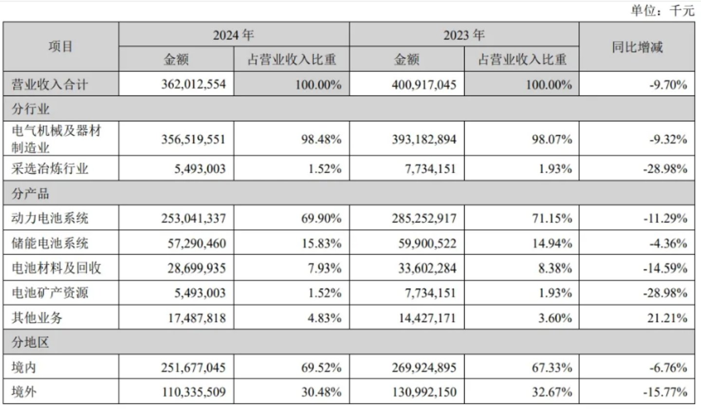 细分到具体业务,动力电池业务依然是收入大头,占总营收的69.9%,但去年这部分收入同比下降了11.29%。这跟新能源汽车行业的发展情况,以及锂电产业链的供需情况有关。