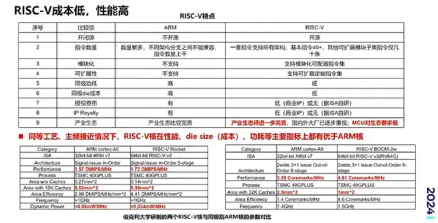 第三,从技术的角度看,RISC-V功耗低、能效高。同等工艺、主频接近情况下。RISC-V核在性施、die size(成本)。功耗等主要指标上都优于ARM核。