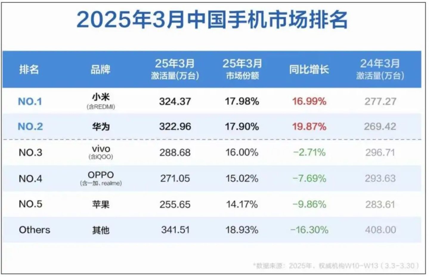 图:2025年第一季度中国大陆手机市场的激活量排名