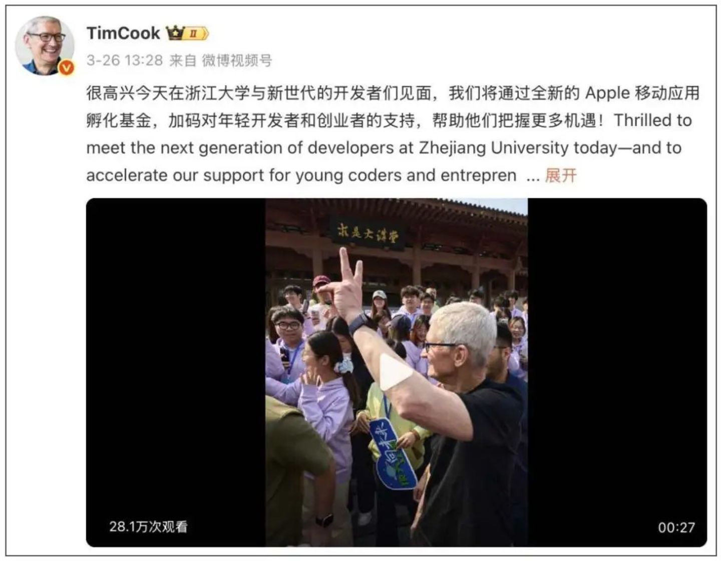 3月26日,库克去了浙江大学,宣布设立“Apple移动应用孵化基金”,投入3000万元人民币,聚焦App开发、产品设计与市场营销培训,并引入导师制与投资人对接机制。