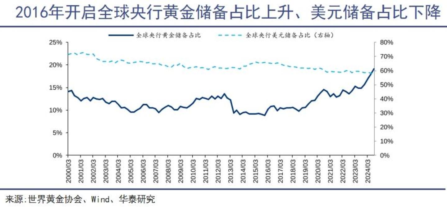 当美元信用权威逐步消散,全球央行、投资者大举买入黄金。2024年全球央行黄金购买量连续11年增长,中国央行黄金储备占比提升到接近5%,俄罗斯、土耳其黄金占比超30%。