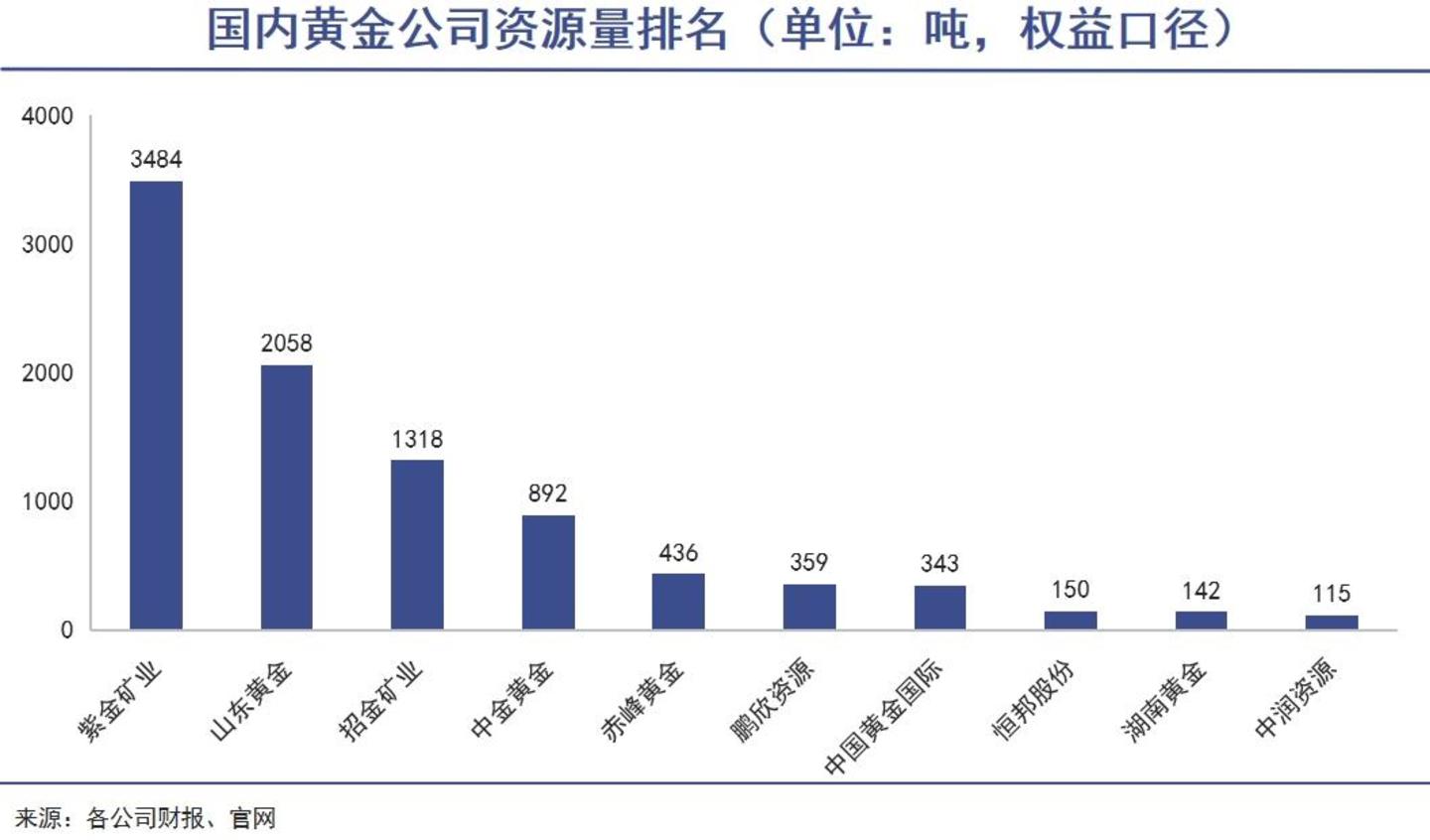 按照权益口径排列,紫金矿业、山东黄金、招金矿业、中金黄金、赤峰黄金、鹏欣资源、中国黄金国际、恒邦股份、湖南黄金、中润资源的黄金资源量位居全国前十名。
