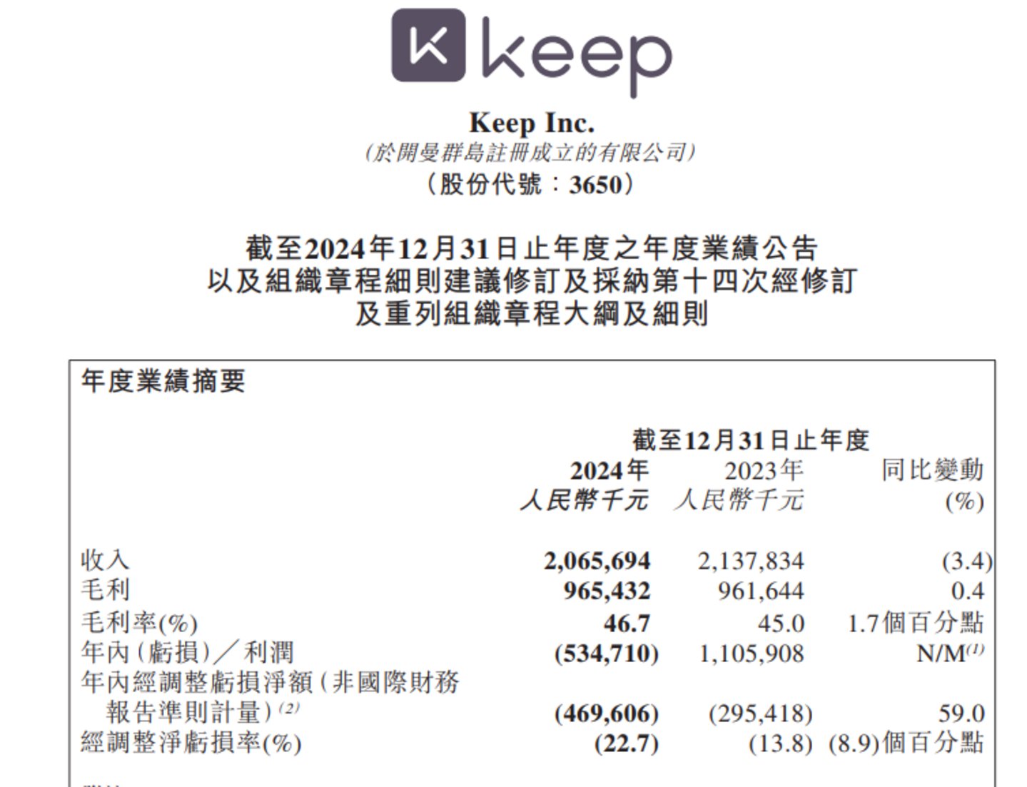 Keep公布的2024年业绩报告显示,公司实现营业收入20.66亿元,归母净利润为-5.347亿元。