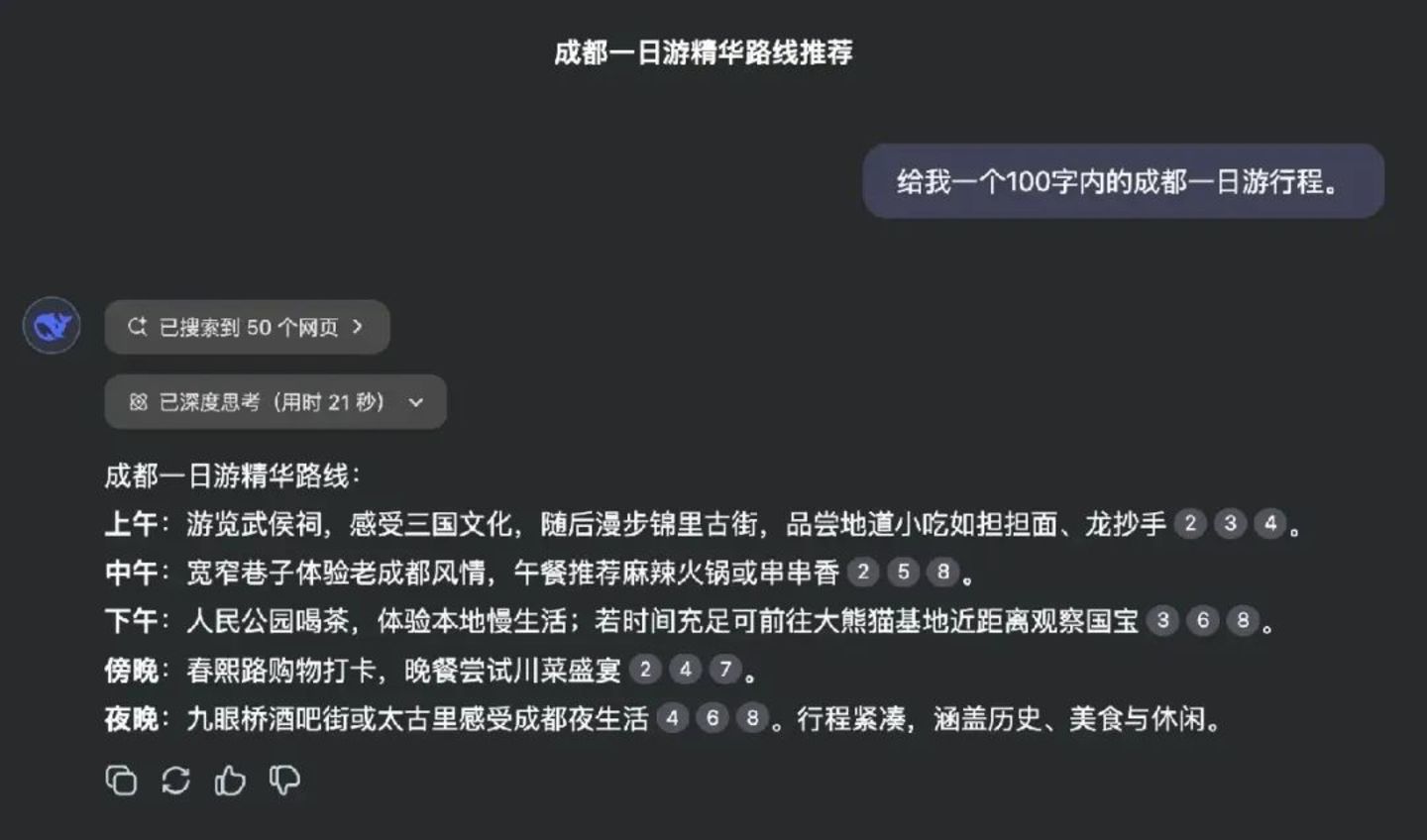 举例一个具体的场景,当你想要去成都旅游时,可能会问 AI 大模型一些基础的攻略: