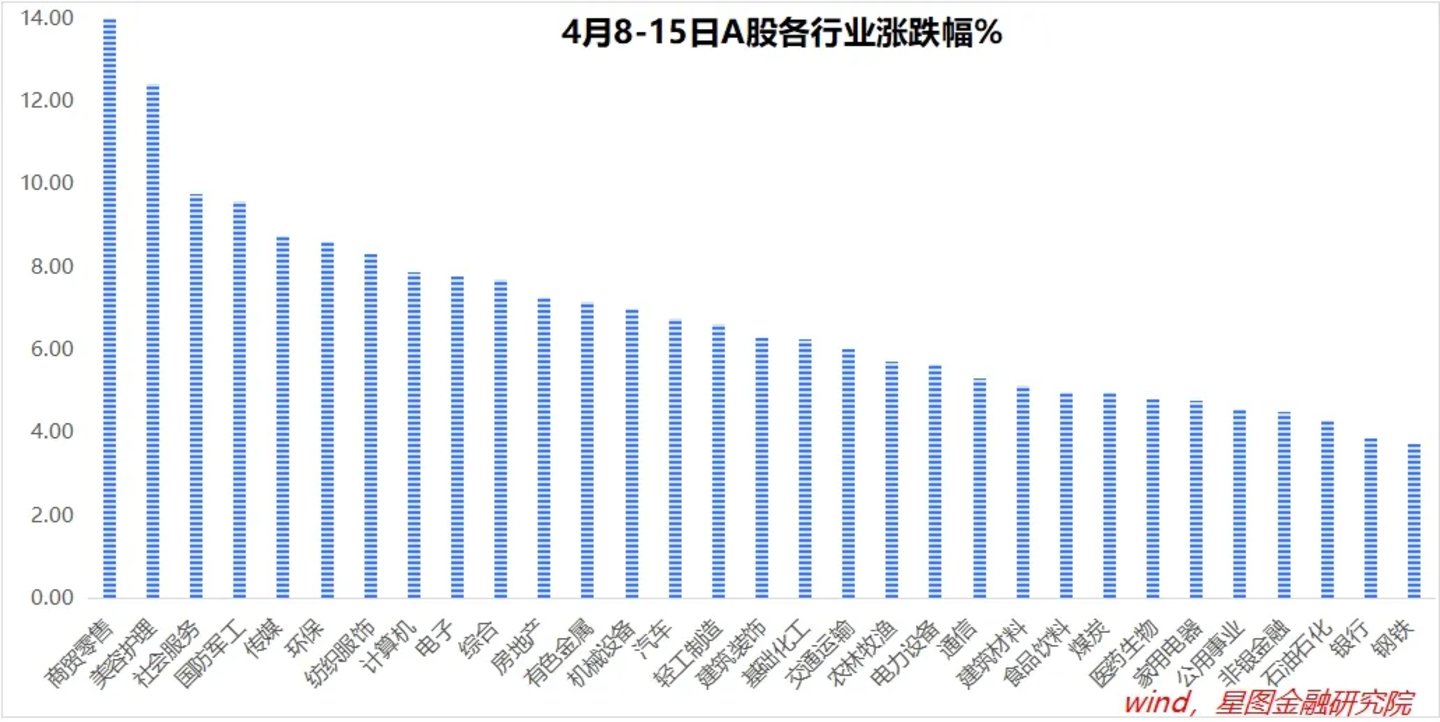 4月8日-15日,商贸零售(14.03%)、美容护理(12.4%)、社会服务、国防军工、传媒、环保、纺织服饰、计算机、电子、房地产等板块均涨超7%,演绎的基本是纯内需和自主可控逻辑。外部不确定性越大,纯内需和自主可控的逻辑催化越强,很容易凝聚市场共识。
