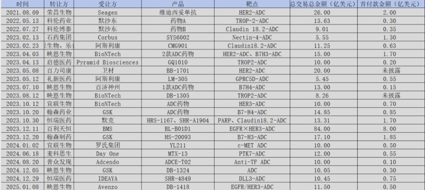 从2021年荣昌生物维迪西妥单抗以26亿美元授权出海,到2022年科伦博泰与默沙东达成总金额超百亿美元的ADC合作,再到2023年百利天恒凭借双抗ADC与BMS签下单个项目84亿美元的“天价交易”,国产ADC的License out纪录一次次刷新行业认知。