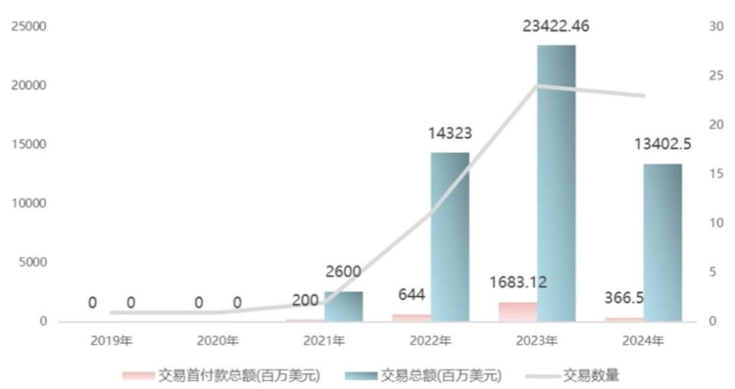 在出海方面,2023年达到巅峰之后,2024年的ADC出海似乎被按下了暂停键。根据Insight数据库的统计,2024年国内ADC出海数量23个,相比2023年,交易数量持平,但重磅项目大幅缩水,总金额下降至134亿美元,较2023年下滑43%,交易首付款只有3.7亿美元,相较2023年下降了78%。