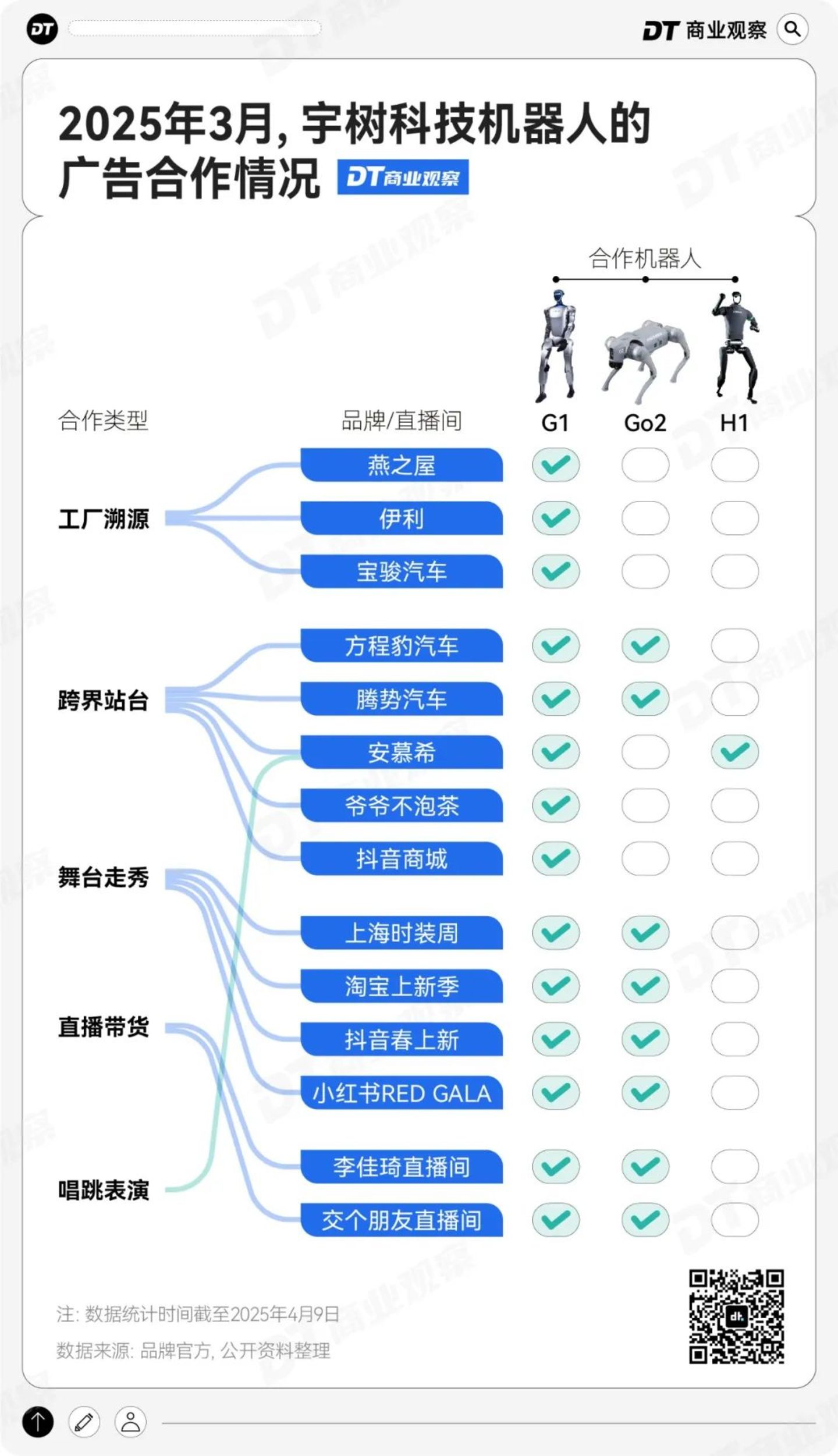 据《DT商业观察》的不完全统计,今年3月,宇树机器人已经和科技、快消、互联网等品牌合作,接拍了十余个商业合作。
