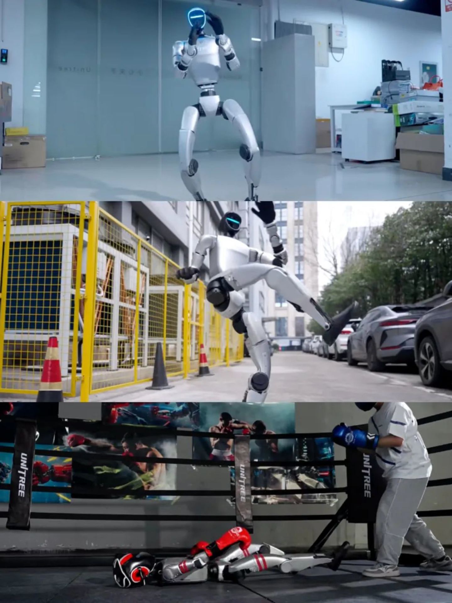 在社交媒体上,宇树机器人G1时而扭着胯模仿2022年春晚邓超跳舞,时而大秀720°回旋踢和鲤鱼打挺,时而有模有样地戴上头盔和手套,和真人上演“拳王争霸赛”。