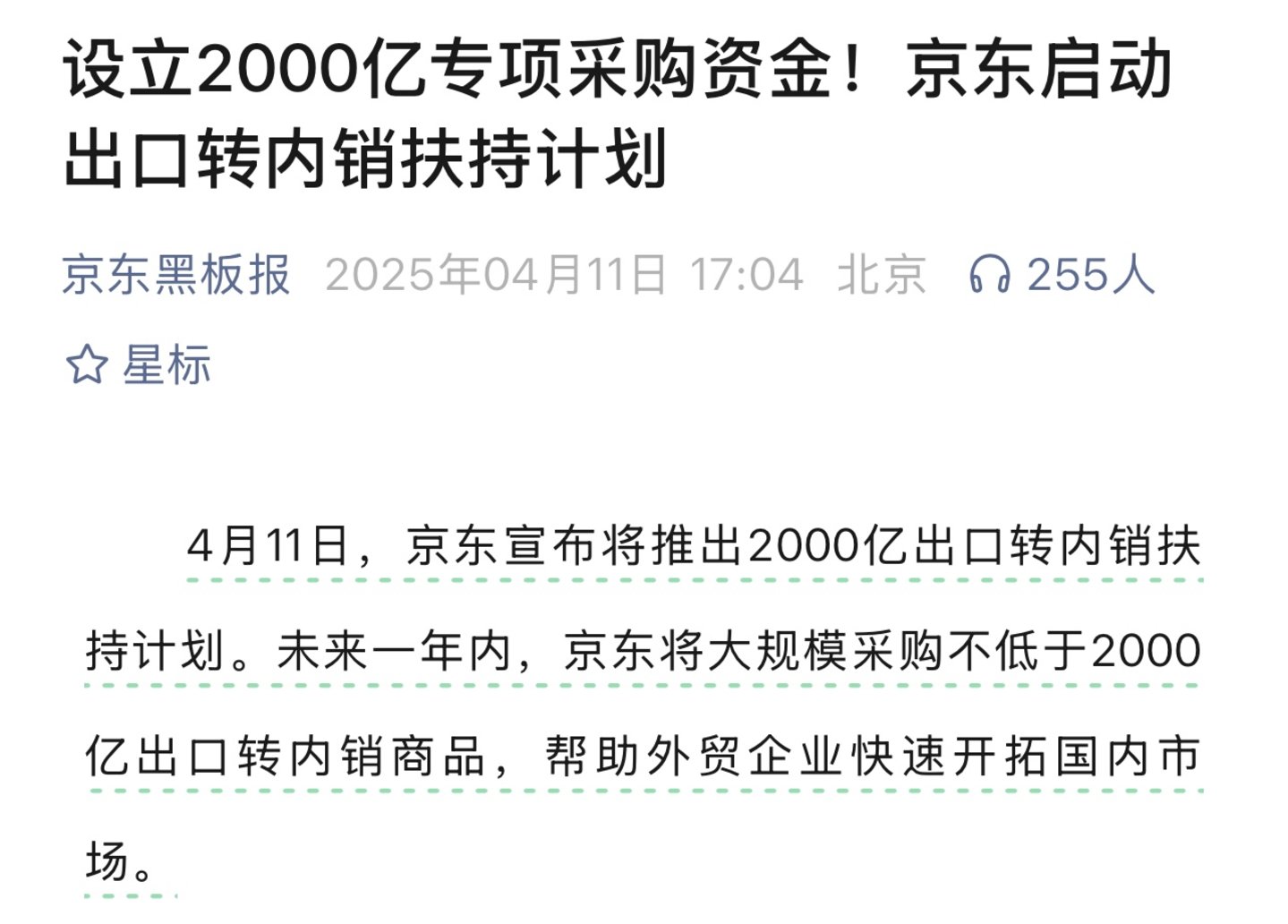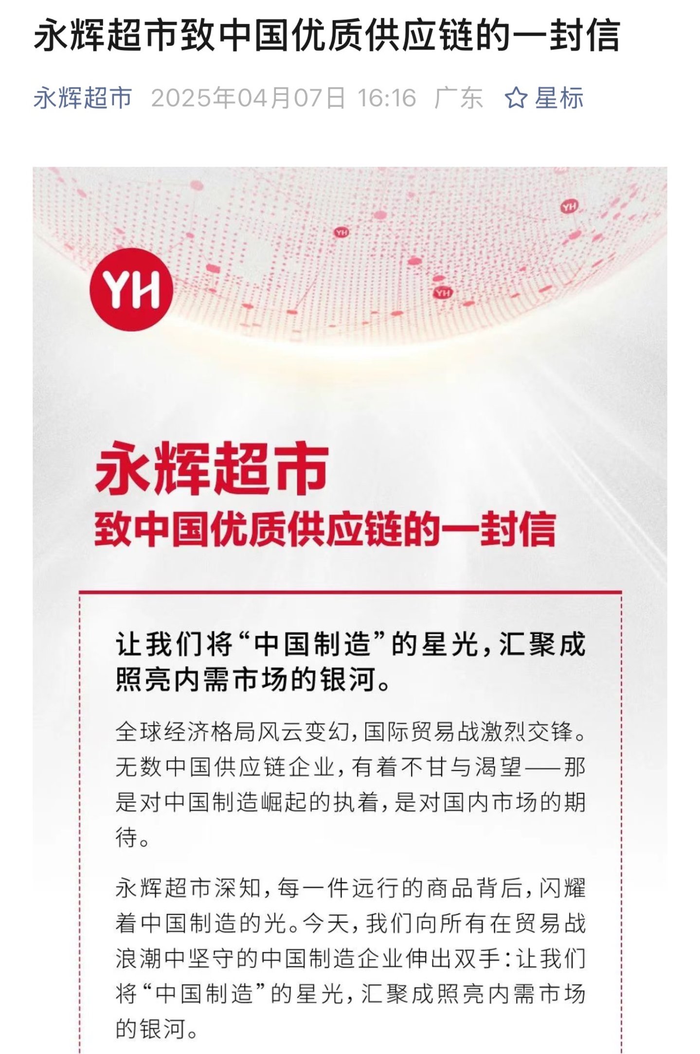 早在4月7日下午,永辉超市就在微信公众号发布了《致中国优质供应链的一信》,一句“让中国制造的星光汇聚成照亮内需市场的银河”,被业内视为传统商超转型的“破局宣言”。