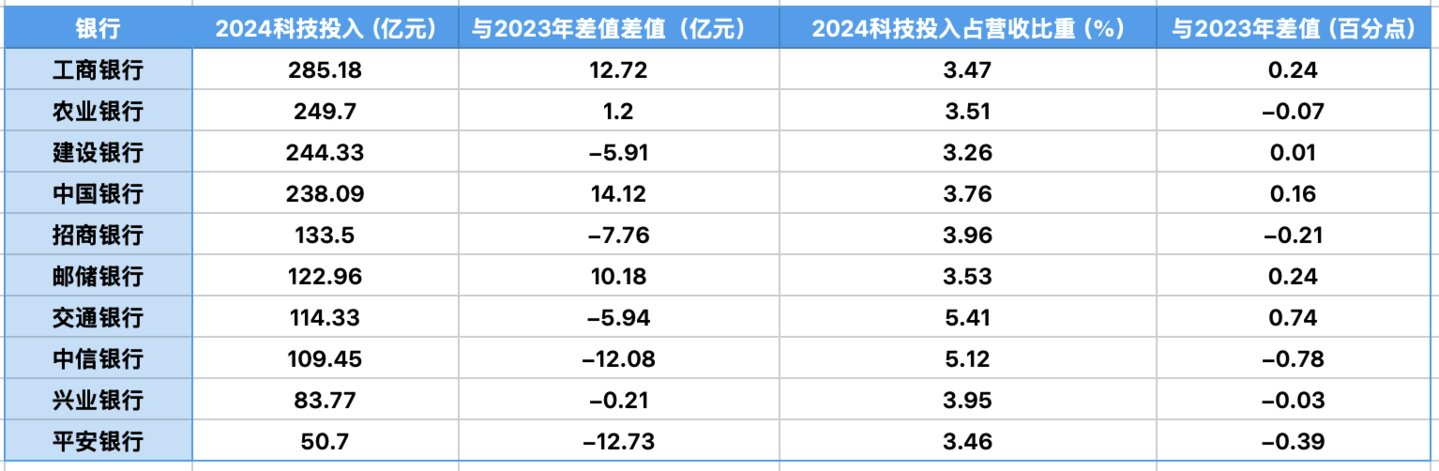 平安银行(-12.73亿元)和中信银行(-12.08亿元)削减幅度最大。招商银行(-7.76亿元)虽金额下降,但2024年科技投入占营收比重仍高达3.96%,居行业前列。交通银行科技投入占比从4.67%升至5.41%,成为唯一占比超5%的银行。