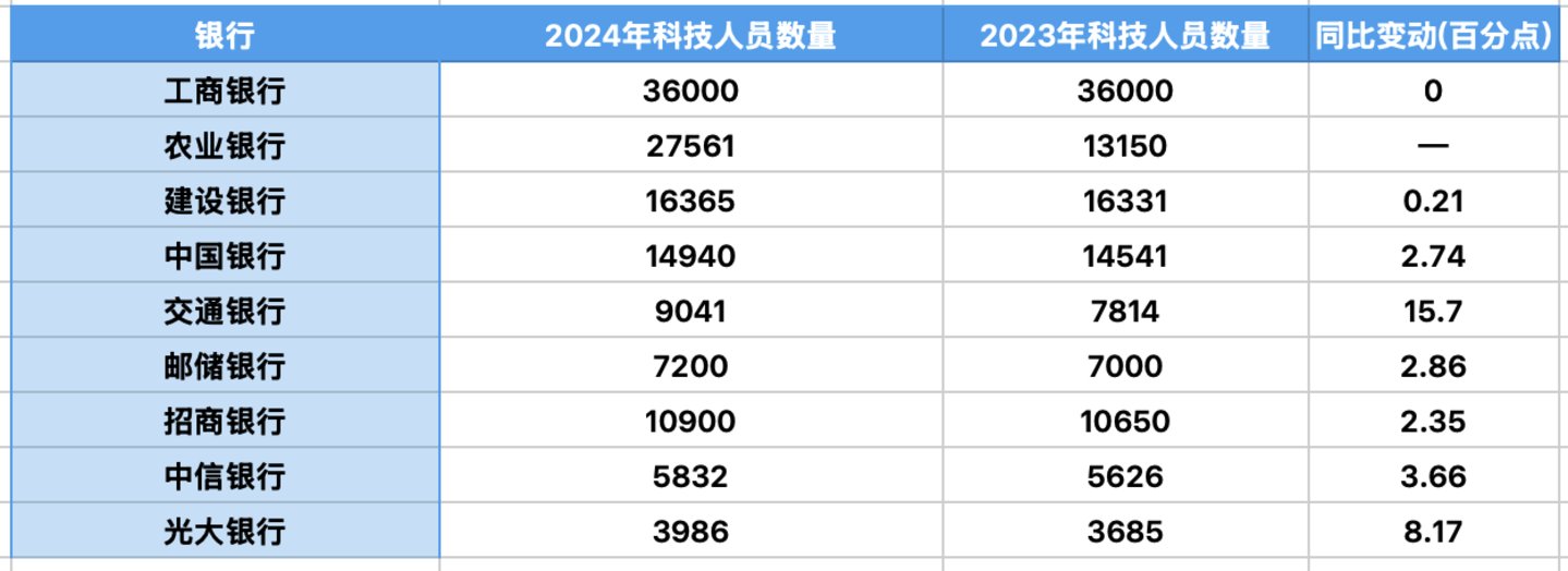与此形成对比的是,从科技人员布局看,这10家银行基本都保持了增长。其中,工商银行科技人员数量高达3.6万人,占全行员工的8.6%。农行对科技人员的披露口径进行了调整,由2023年的“科技人员”类别调整为“科技与数字化运行管理人员”。中行、建行金融科技类人员数量也均超过万人,在集团人数中的占比分别为4.78%、4.34%。交行的金融科技人员为9041人,较上年末增长15.70%