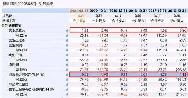 今年一季度,皇庭国际收入虽然有恢复性增长,但净利润却下滑76.79%。