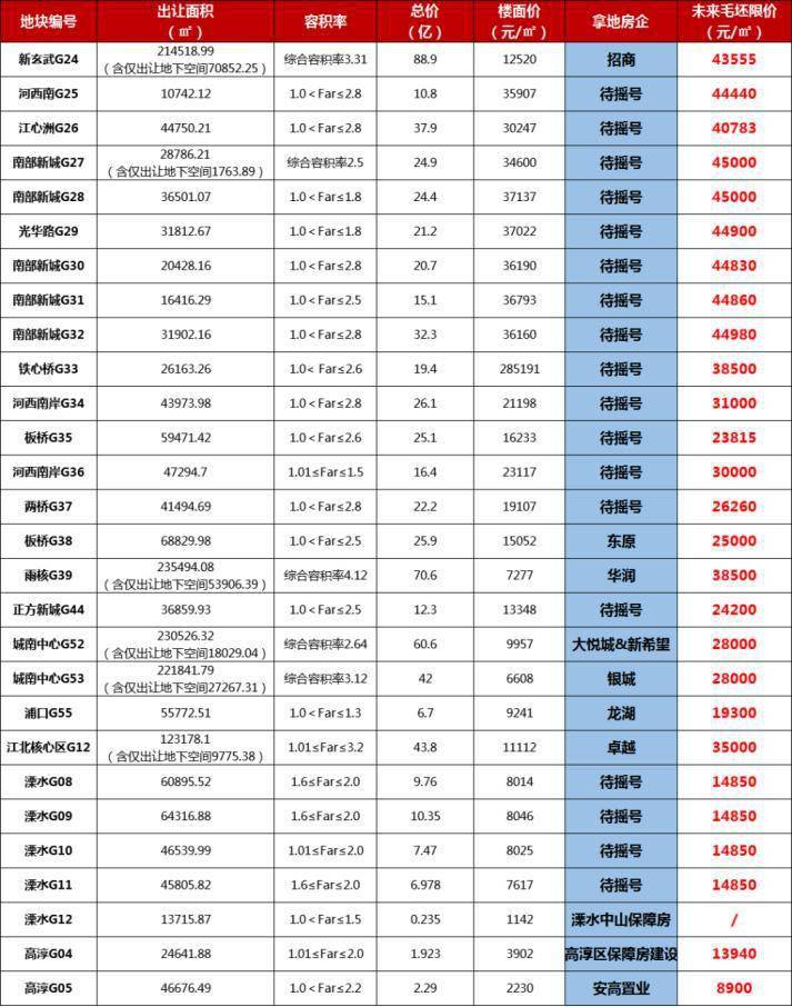 最新消息显示,NO.新区2021G12号地块,卓越以底价43.80亿元成交。该地块位于江北新区定山大街以北、浦滨路以西地块,出让面积113402.72平方米,容积率3.2,建筑面积362888.70平方米,起价43.8亿元,楼面起价12069.82元/平方米;最高限价52.5亿元,商品住房(毛坯)销售均价35000元/平方米。