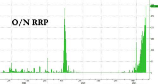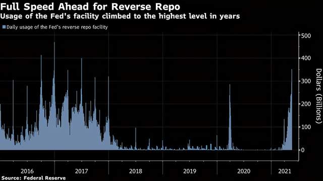 最近几周,ON RRP使用情况可能更加值得关注,因为有数据显示,ON RRP的用量刚刚创了近几年新高,以当前的这种增长形势,美联储的QE可能就要走到尾声了。