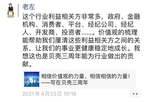 左晖的最后一次公开露面是4月央视财经的《遇见大咖》,他的最后一条朋友圈则停留在4月23日贝壳找房3周年:“这个行业利益相关方非常多,政府、金融机构、消费者、平台、经纪公司、经纪人、开发商、投资者……价值观的梳理能帮助我们厘清这些利益相关方之间的关系,让我们的事业更健康稳定地成长。我想这也是贝壳三周年能为行业做出的贡献。”