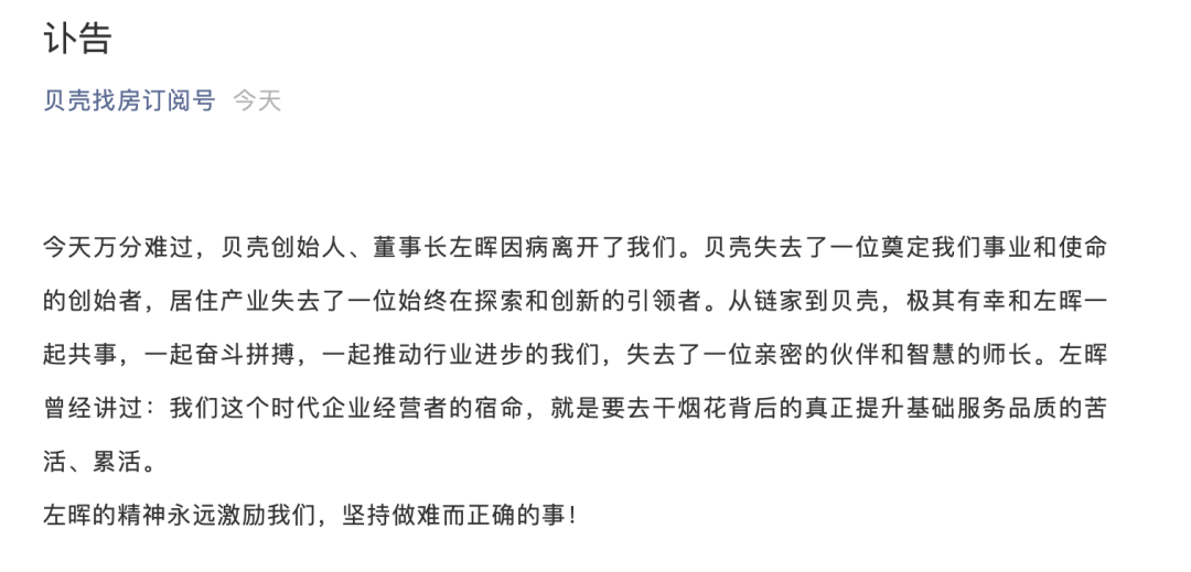 2021年5月20日下午,贝壳找房订阅号突发讣告:“今天万分难过,贝壳创始人、董事长左晖因病离开了我们。”