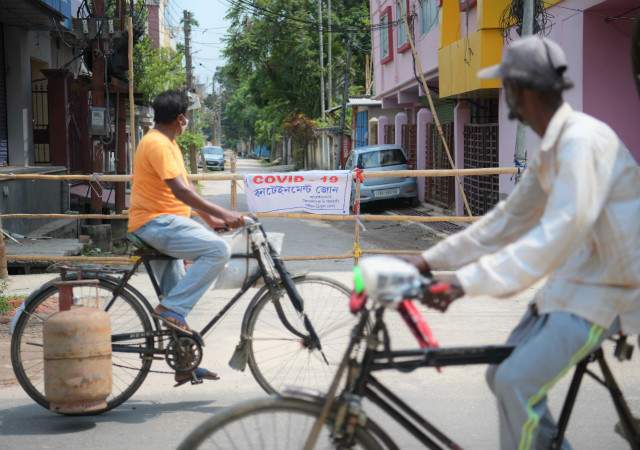 5月15日,人们骑车经过印度阿加尔塔拉一处隔离区。新华社图。