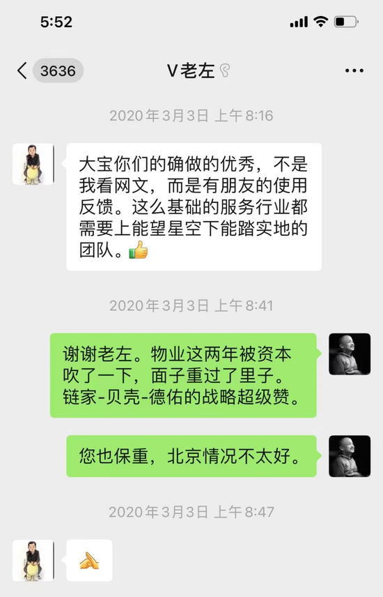 万物云CEO朱保全昨日晚间在朋友圈悼念突然病逝的贝壳创始人左晖。朱保全发了两张他去年8月与左晖的私信截图,当时正值贝壳找房登陆纳斯达克,朱保全向左晖发信祝贺,左晖回复称“万科物业和贝壳的赛道都是又长又湿的雪道,希望能向大宝(朱保全昵称)和万物的团队多学习!”
