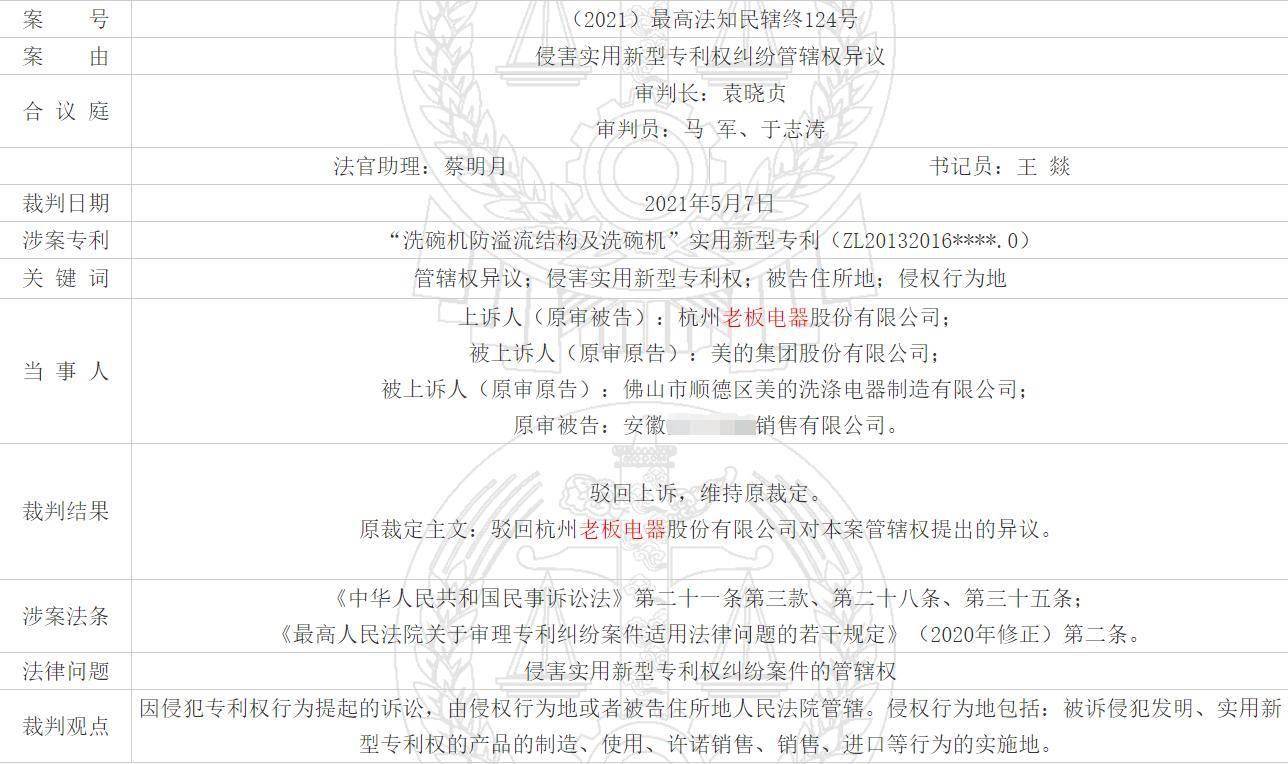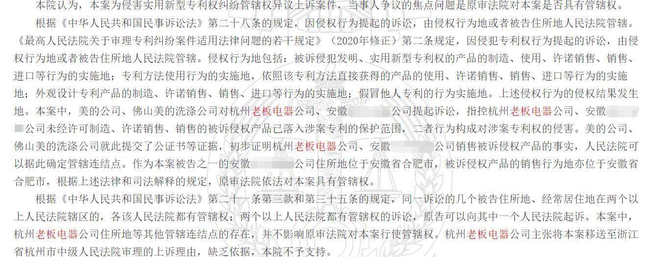 而老板电器在提交答辩状期间对案件管辖权提出异议,老板电器认为因侵犯专利权行为提起的诉讼,由侵权行为地或者被告住所地人民法院管辖,其住所地为浙江省杭州市余杭区经济开发区临平大道592号,被诉侵权产品的生产地亦在浙江省杭州市,从侵权行为关联度及紧密度判断,应当认定浙江省杭州市为侵权行为地。老板电器认为原审法院对本案不具有管辖权,因此上诉至中华人民共和国最高人民法院,请求将本案移送至浙江省杭州市中级人民法院审理。