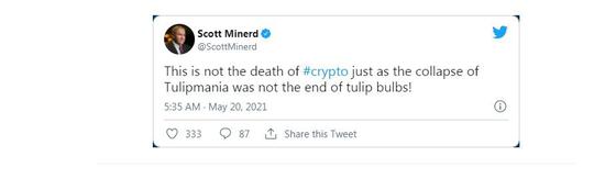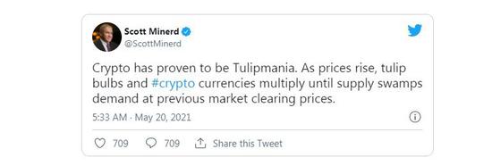 对比特币态度180度大转弯的不只是马斯克,券商古根海姆的首席投资官斯科特-米纳德(Scott Minerd)在周三的暴跌行情中发推,将加密货币投机比作17世纪的“郁金香狂热”。而就在上个月,他还预测比特币价格最终可能达到60万美元。
