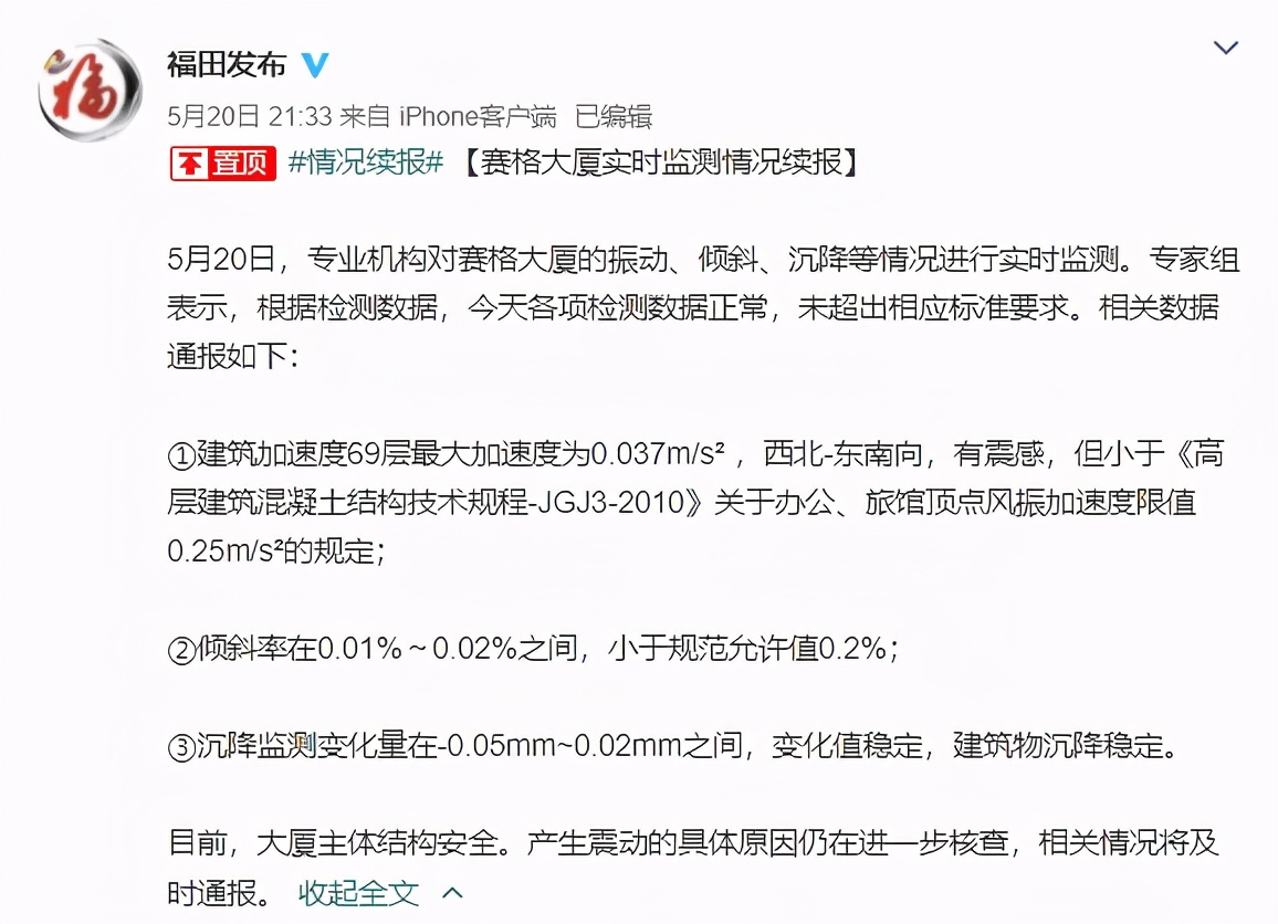 5月20日,@福田发布 再次公布“情况续报”称:专业机构对赛格大厦的振动、倾斜、沉降等情况进行实时监测。专家组表示,根据检测数据,今天各项检测数据正常,未超出相应标准要求。
