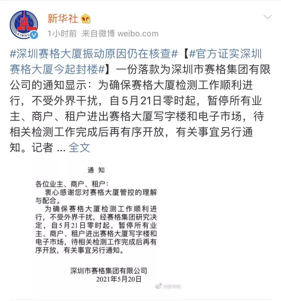 “为确保赛格大厦检测工作顺利进行,不受外界干扰,自5月21日零时起,暂停所有业主、商户、租户进出赛格大厦写字楼和电子市场,待相关检测工作完成后再有序开放,有关事宜另行通知。”