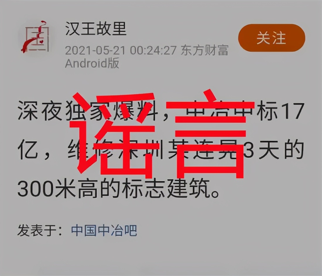 网传截图显示,名为“汉王故里”的账号发布消息称,中冶中标17亿,维修深圳某连晃3天的300米高的标志性建筑。