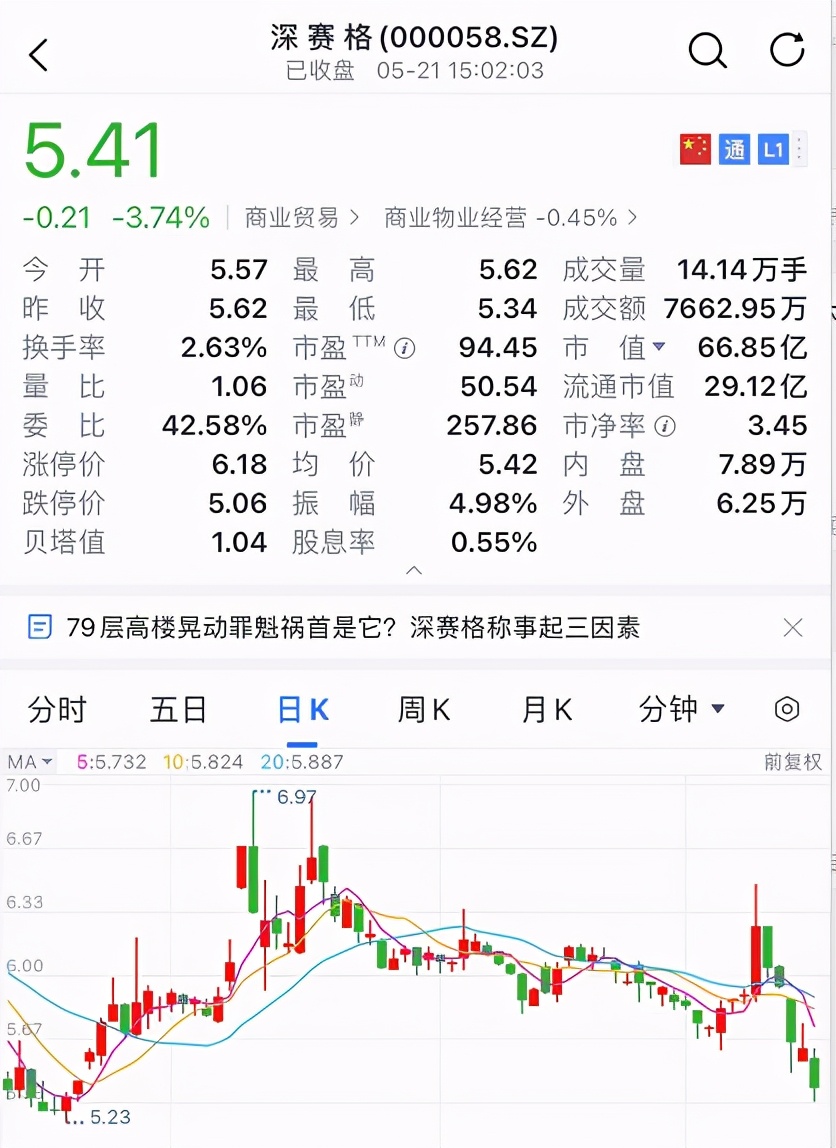 据悉,持有赛格大厦部分物业的上市公司深赛格19日股价大幅低开,跌幅超过7%,全天累计跌幅为4.88%。20日,深赛格微跌收盘,收盘价为5.62元,下跌0.53%。
