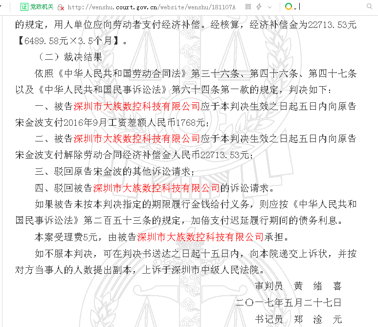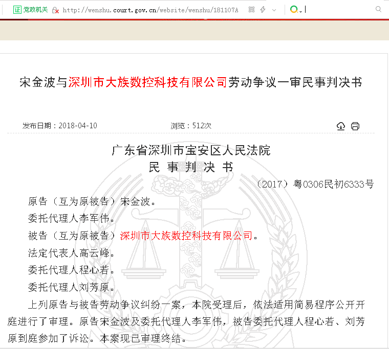 中国裁判文书网于2018年4月10日发布的《宋金波与深圳市大族数控科技有限公司劳动争议一审民事判决书》即《广东省深圳市宝安区人民法院民事判决书》(2017)粤0306民初6333号显示,依照《中华人民共和国劳动合同法》第三十六条、第四十六条、第四十七条以及《中华人民共和国民事诉讼法》第六十四条第一款的规定,判决如下: