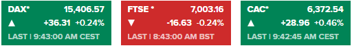 欧洲股市周五早盘大体上涨,欧洲斯托克600指数涨0.16%,意大利FTSE MIB指数涨0.36%,英国富时100指数跌0.24%,法国CAC 40指数涨0.46%,德国DAX指数涨0.24%。