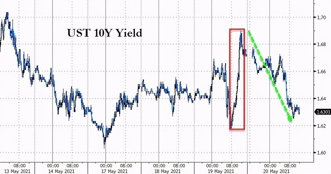 行情数据显示,10年期美债收益率周四尾盘下跌4.7个基点报1.63%,回吐了周三美联储纪要公布后的多数涨幅。美联储周三公布的4月会议记录显示,鉴于经济继续强劲复苏,“多位”美联储官员似乎准备开始考虑调整资产购买步伐。随后,美债收益率一度急升。