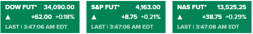 截至发稿,道指期货涨62点,报34090.00点,涨幅为0.18%;标普500指数期货涨0.21%,报4163.00点;纳指期货涨0.29%,报13525.25点。