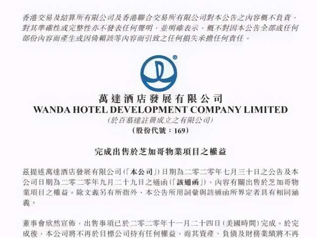 去年11月25日,万达酒店发布公告称,美国时间11月24日,公司完成出售芝加哥物业项目,公司将不再持有目标公司任何权益,目标公司的资产、负债及财务业绩将不再综合计入公司的综合财务报表。