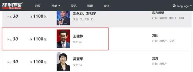 根据最新的胡润百富榜显示,王健林以1100亿身价,在中国富豪榜上排名第30位。