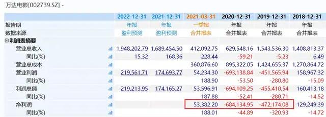 随着国内疫情防控形势不断向好,中国电影市场持续复苏。万达电影2021年第一季度实现营业收入41.2亿元,同比增长228.44%;归属于母公司的净利润5.24亿元,同比增长187.38%,成功实现扭亏为盈,并取得近年来单季度最佳成绩。