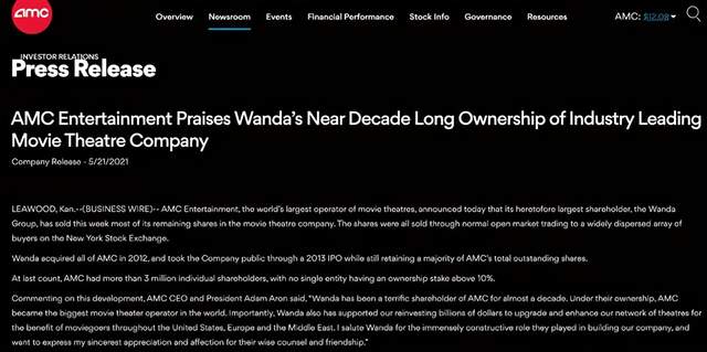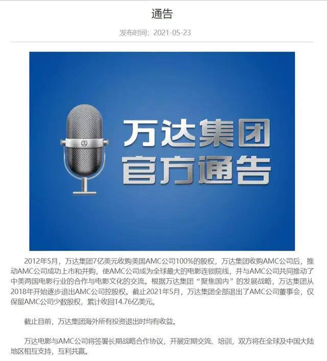 5月23日早间,万达集团通过官网发布通告称,截止2021年5月,万达集团全部退出了美国AMC公司董事会,仅保留AMC公司少数股权,累计收回14.76亿美元(约97亿元人民币)。