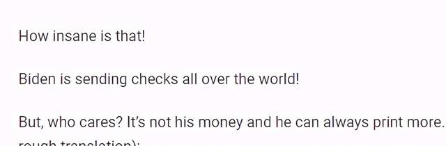 有外媒感慨,“这太疯狂了!拜登正在向全世界发送支票!但是,谁在乎呢?这又不是他的钱,他总是可以印更多。”