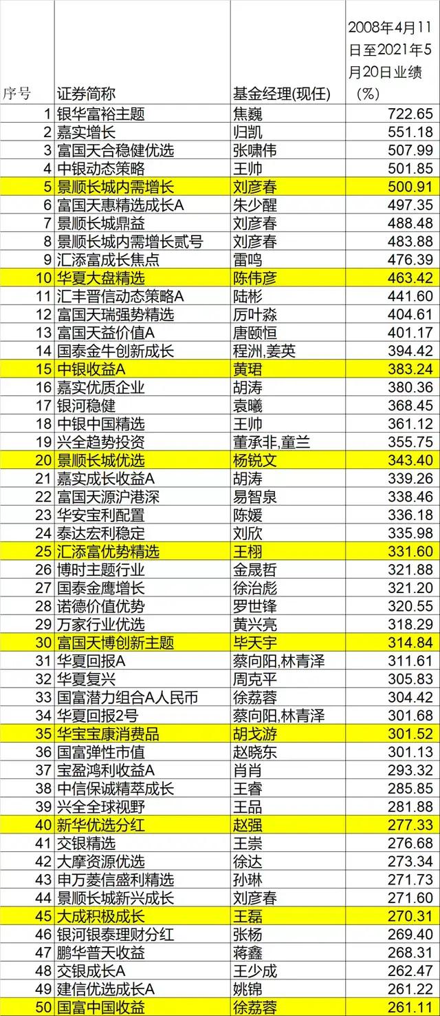 更令市场瞩目的是业绩最好的银华富裕主题,这段时间的收益率高达722.65%,表现非常突出。紧随其后的是嘉实增长、富国天合稳健优选收益、中银动态策略、景顺长城内需增长,期间收益率均超过500%。