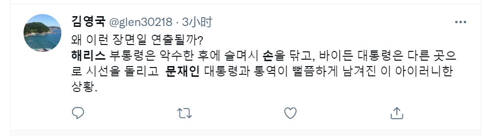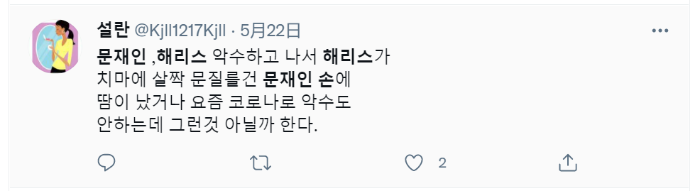 “文在寅和哈里斯握手后,哈里斯在裙子(原文如此)上轻轻地擦了一下。可能是因为文在寅出手汗或者最近因为疫情(大家互相)也不握手。