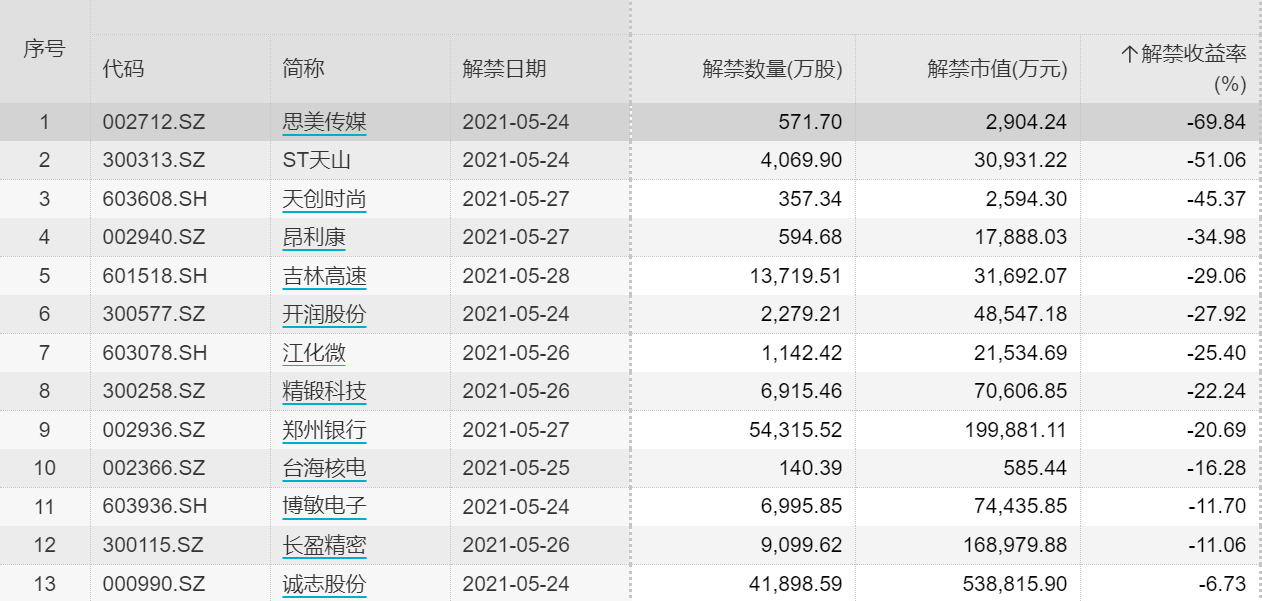 解禁股数量第二的诚志股份定增股东也浮亏逾6%。本周,诚志股份股价跌8.34%,收于12.86元。 另外,思美传媒(002712.SZ)、ST天山(300313.SZ)、天创时尚(603608.SH)三只个股的定增解禁收益率分别亏损69.84%、51.05%、45.37%。