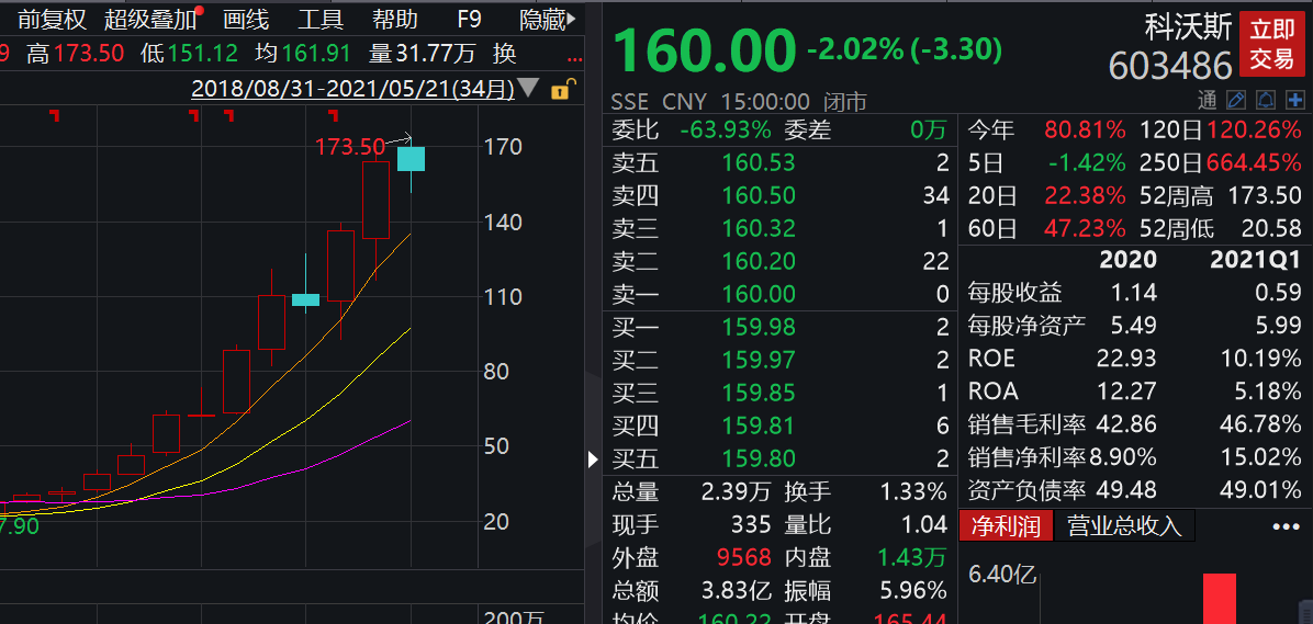 科沃斯也由此成为过去一年的大牛股。Wind数据显示,该公司股价从2020年4月底的17.9元启动,一路涨至今年5月初的历史最高价173.5元,区间涨幅超9倍;相较首发价格更是涨逾十倍。