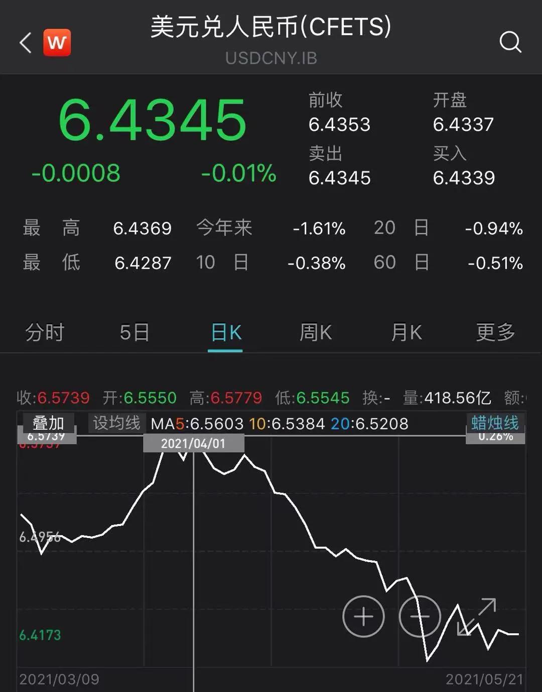 自4月以来,人民币兑美元汇率持续升值。截止目前,在岸人民币兑美元汇率升破6.44,达到6.4345左右,4月以来累计升值幅度达到2%左右。