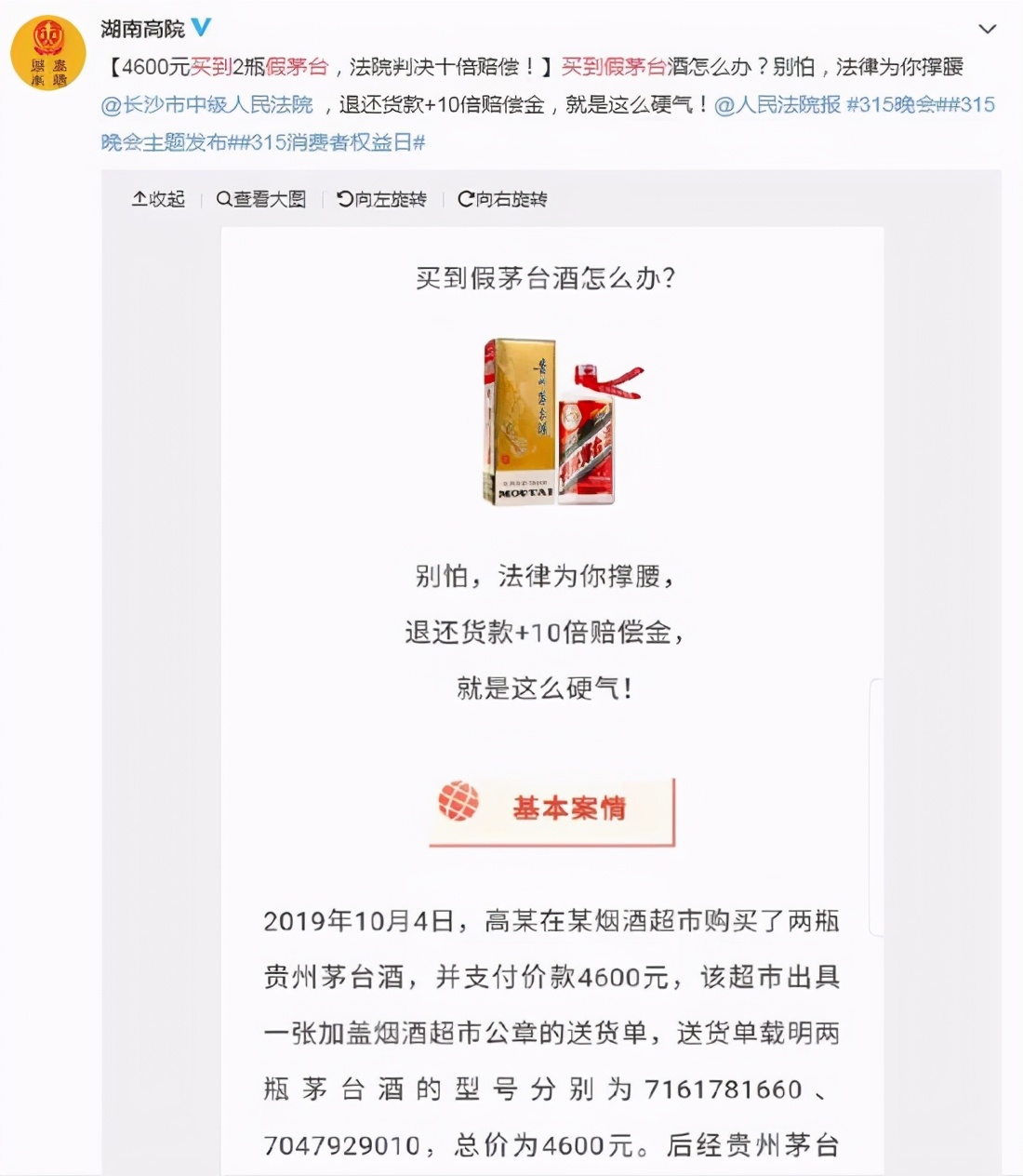 湖南高院还表示:“买到假茅台酒怎么办?别怕,法律为你撑腰,退还货款+10倍赔偿金,就是这么硬气!”