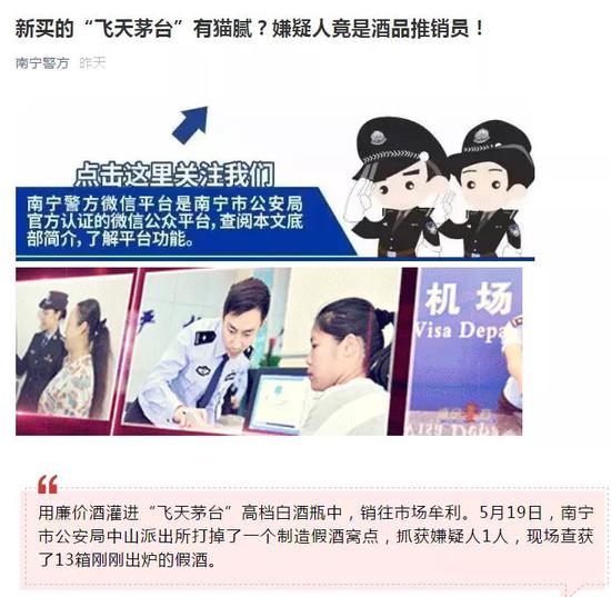22日,南宁警方公布的案件显示,5月19日,南宁市公安局中山派出所打掉了一个制造假酒窝点,抓获嫌疑人1人,现场查获了13箱刚刚“出炉”的假酒。同时,该嫌疑人还伪装成某大型酒类销售公司的销售员,称可以拿到比市面上低几百元不等的茅台酒,由此获得了客户的信任。