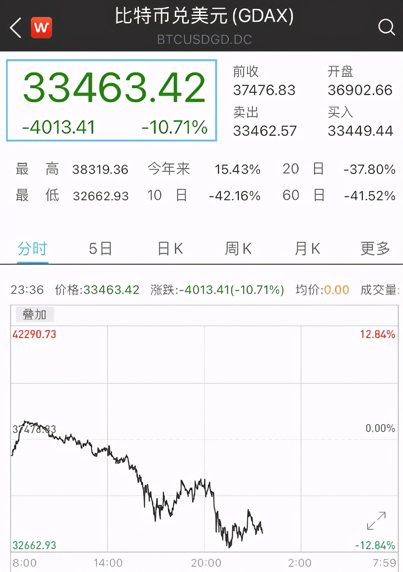 截至发稿,比特币兑美元一日跌去4000美元,现报33463.42美元/枚,跌10.71%。