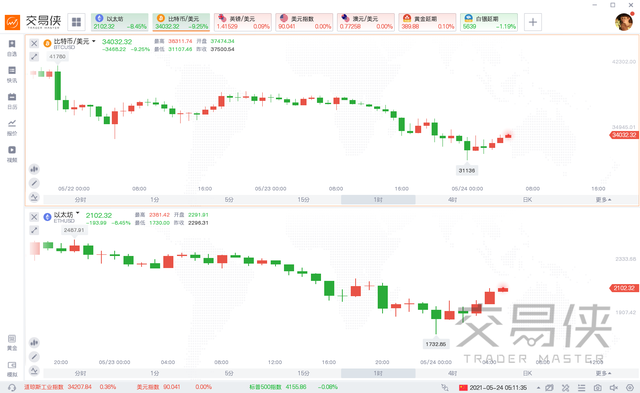 截止北京时间周一(5月24日)凌晨00:25 左右,比特币日内重挫15.04%,报31800美元/枚;以太坊日内暴跌21.34%,报1805.01美元/枚;瑞波币、莱特币分别暴跌26.60%和26.33%。随后,主要加密货币有所反弹。